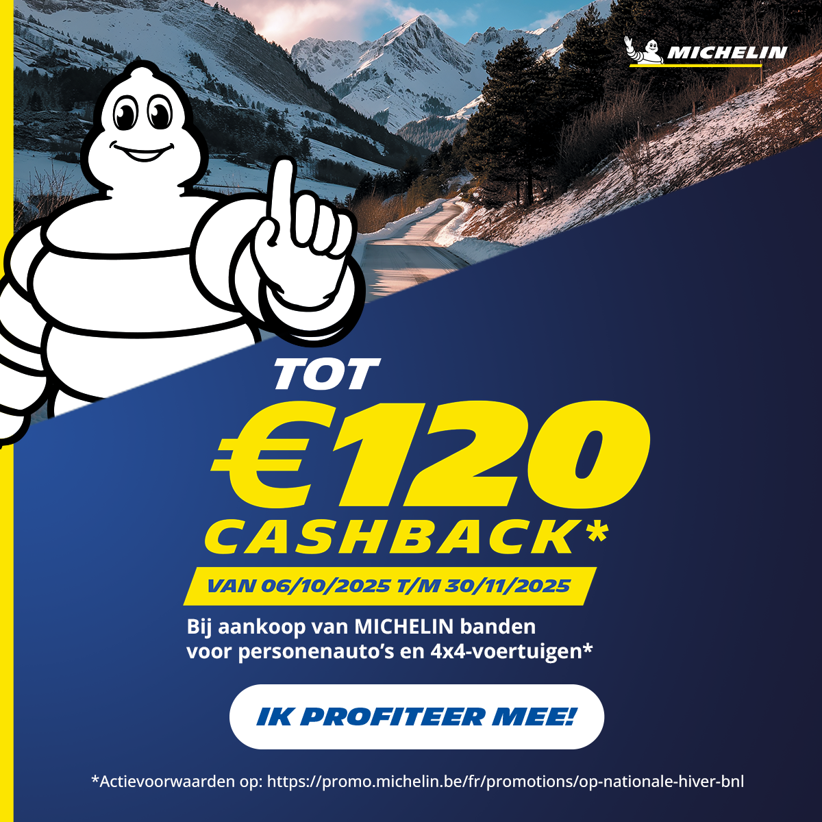 Van 6 oktober t/m 30 november 2025 vergoedt MICHELIN u tot € 120 voor de aankoop van 2 of 4 MICHELIN-banden in de categorie personenwagen en 4×4 (Zomer, Winter of Crossclimate ) van dezelfde maat en hetzelfde assortiment;
